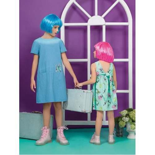 Платье для девочек. Широкий пояс-лепесток; глубокий вырез горловины на спинке.