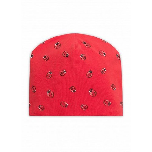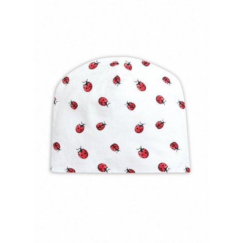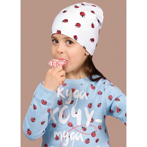 Трикотажная шапка для девочек с контрастными принтом "божьи коровки" по всему изделию.