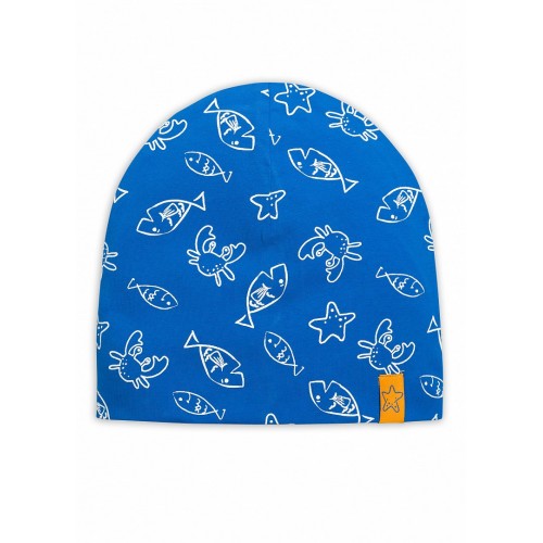 Незаменимая, удобная двойная шапка из эластичного хлопкового материала. По всему изделию принт-рыбки в скетчевой технике, спереди небольшая нашивка.