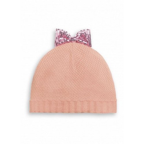 Шапка ажурной вязки с бантиком, который выполнен из ткани с блестящими пайетками.