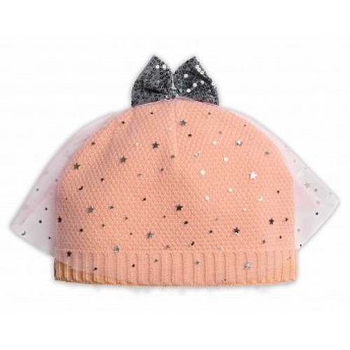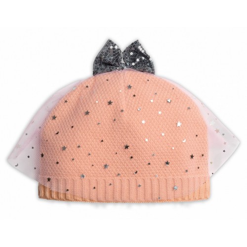 Стильная шапка с вуалью; блестки в виде звездочек; контрастный бант.