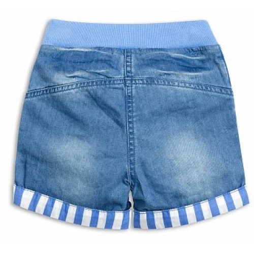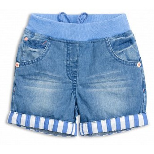 Джинсовые шорты, с отворотами в полоску, оригинальные клёпки с розовыми сердечками.