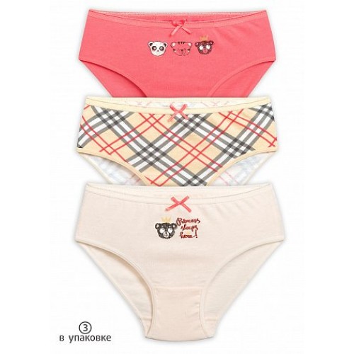 Комплект из 3-х трусиков-слипов для девочек. Средняя посадка, принт - каррикатурные мишки и клетка.