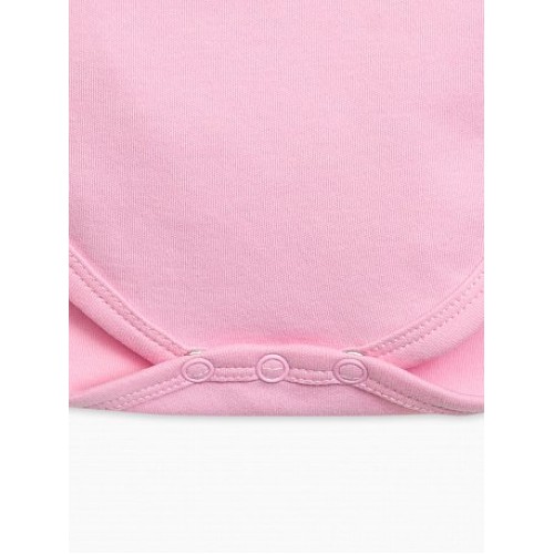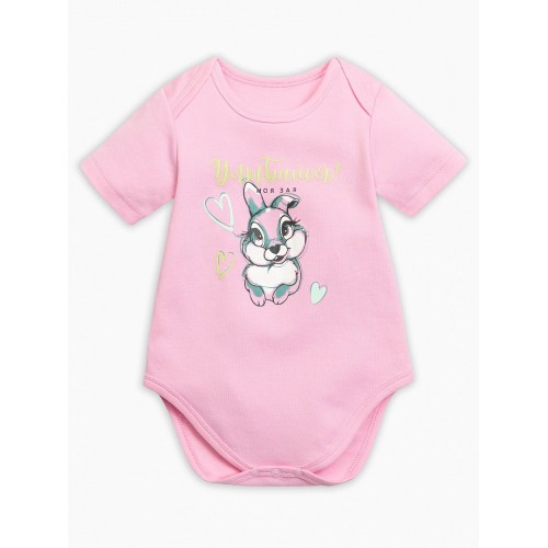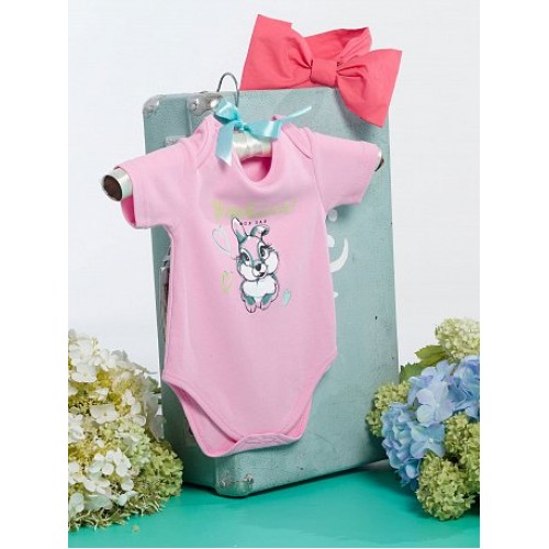 Полукомбинезон для девочек. Выполнен в нежном розовом цвете, застёжка на кнопки в нижней части изделия. Центральный принт: весенний кролик, отрисованный в скетчевой графике, и надпись "Улыбайся! Моя зая".