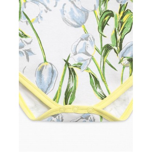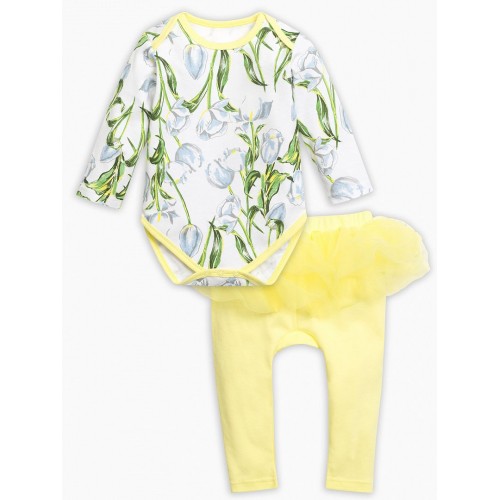 Комплект для девочек: боди и брючки. Боди с длинным рукавом. All over принт с сочными тюльпанами, отделка горловины и нижней части изделия из основной ткани контрастного цвета. Застёжка на кнопки в нижней части изделия. Брючки умеренного объёма, по талии декорированы мягкой многослойной сеткой из фатина.
