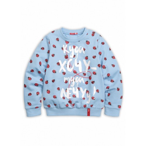 Классический свитшот. По всему изделию принт "божьи коровки" и надписью по переду "Куда хочу- туда лечу!". Низ подхватывается манжетой с лейблом по переду.