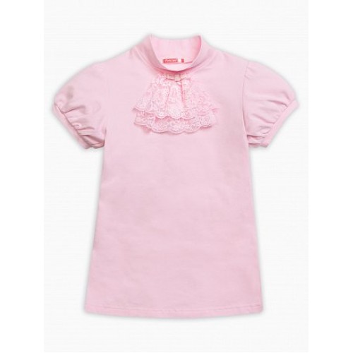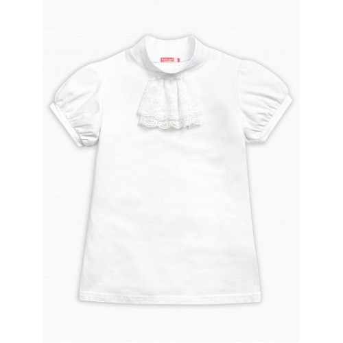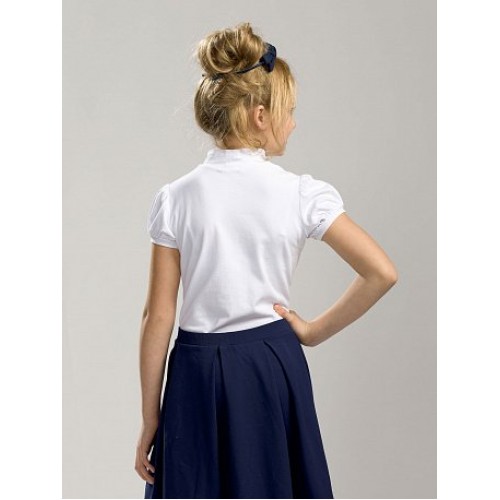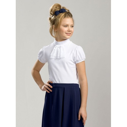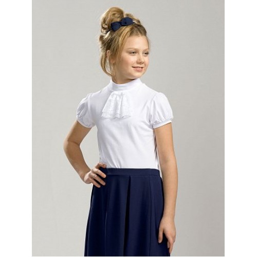 Футболка для девочек. Модель футболки, которая подходит как для повседневной носки, так и для торжественных школьных случаев. Неоспоримая романтика и нежность. Воротник-стойка украшен легким кружевным жабо и маленьким бантиком.