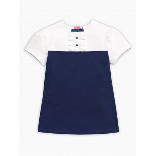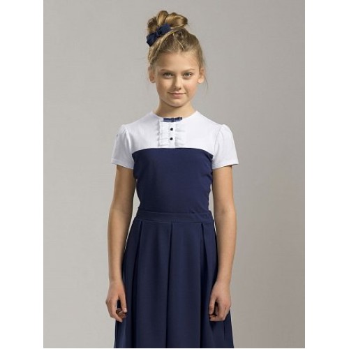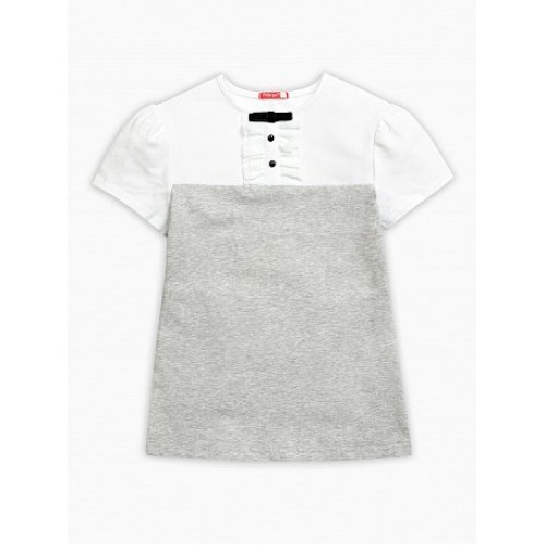 Футболка для девочек. Новая модель футболки. Изделие имитирует «два в одном» — корсет и блузку. Отличительным элементом «блузки» является имитация планки с пуговками, также планка декорирована двумя рядами рюш из сетки и бархатным бантиком.