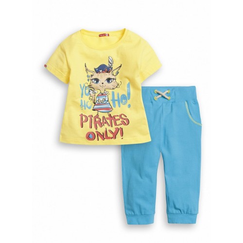 Бриджи с удобной посадкой, цветные отделочные строчки вдоль входа в карман, на поясе вставка с декоративным элементом. Футболка с ярким принтом.
