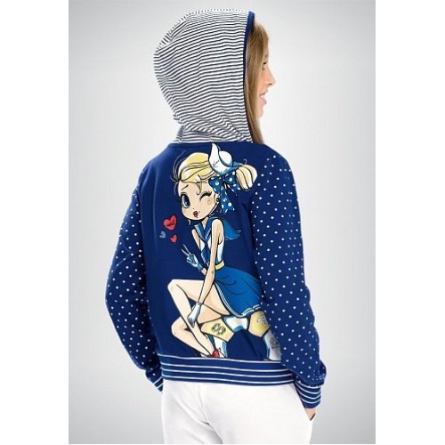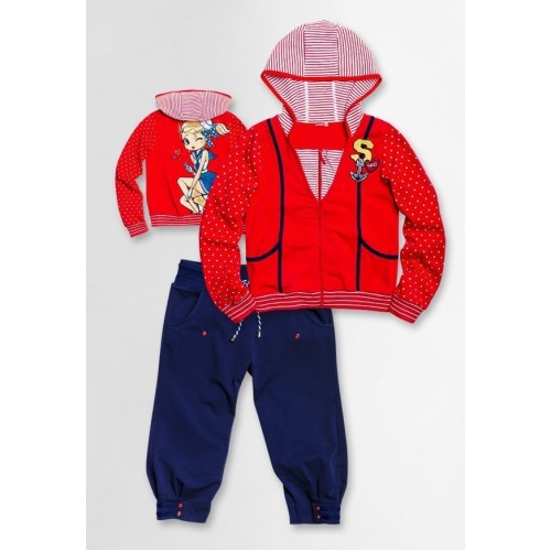 Комплект для девочек (жакет на молнии, с длинным рукавом с капюшоном + длинные брюки). В отделке используются нашивки.