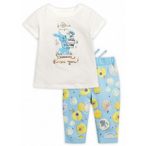 Комплект для девочек: футболка и бриджи. Футболка со свободным плечевым кроем.  Центральный принт кролик, который несёт одуванчик. Бриджи с поясом на резинке, внутренняя  регулировка по поясу шнуром; защипы по низу брюк. Графический принт.