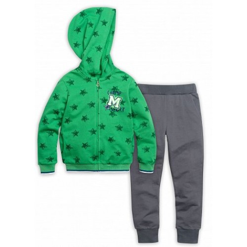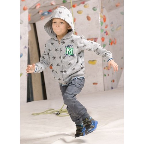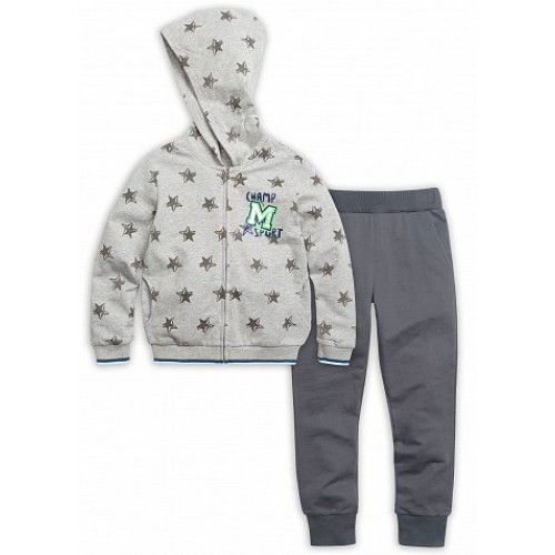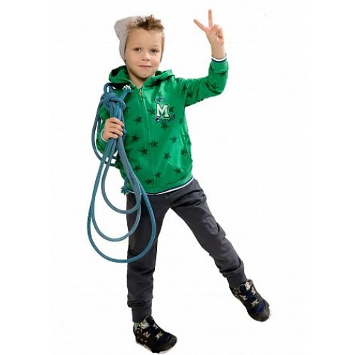 Комплект для мальчиков: джемпер и брюки. Куртка из тонкого футера с капюшоном. Застежка - тракторная пластиковая молния, карманы в боковых швах. Низ куртки и манжеты из рибаны с тканой полоской. Принт звезды мягкий в структуре ткани, принт "M" - плотный, имитирует нашивку. В брюках слегка заужен шаговый шов,  манжеты и пояс из эластичной рибаны. Пояс с регулировкой ширины, карманы.