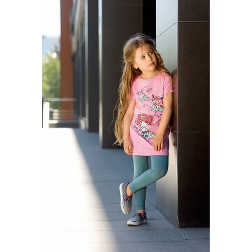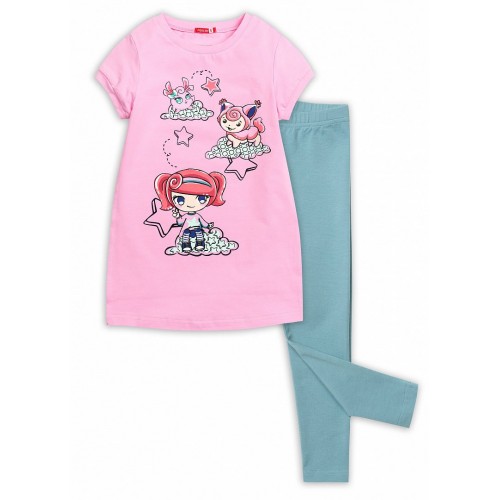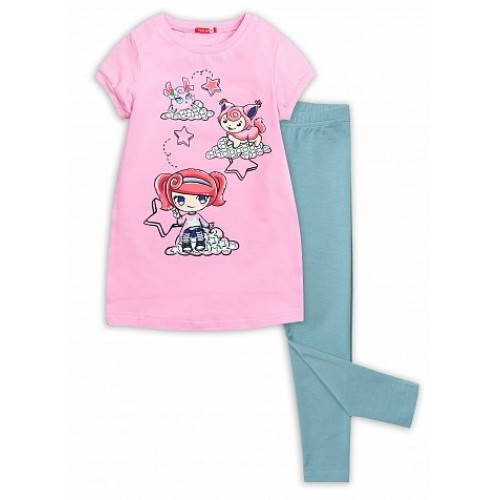 Комплект: туника и брюки. Туника с коротким рукавом оптимального объема и длины из эластичного трикотажа; контрастный принт. Удобные в надевании объемные лосины.