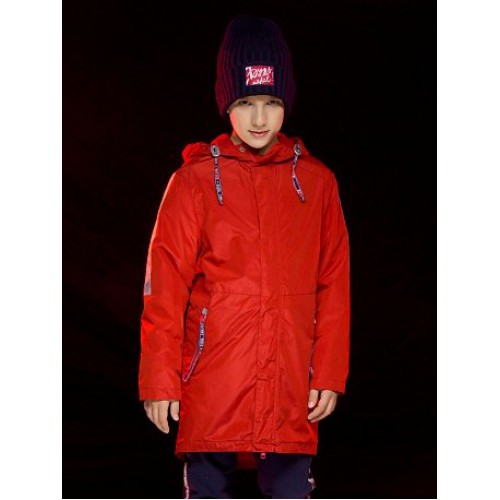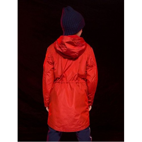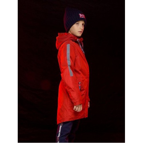 Плащ для мальчиков. Температурный режим: до +5°С. Утепленный плащ. Удлинённый О-силуэт с перепадом длины по спинке и переду. Многозональный подклад: флис по стану, утеплитель из легкого синтепона в рукавах и ниже линии талии. Теплый двухшовный неотстегивающийся капюшон с регулировкой объема. Курточная ткань с двусторонним водооталкивающим покрытием. Широкая ветрозащитная планка на кнопках. Тракторные молнии. Боковые карманы на молнии, с ограничителями и пуллерами из тесьмы. Внутреняя регулировка по линии талии шнуром со стоппером. Внутренняя манжета по низу рукава из рибаны. Световозвращающие нашивки и канты.