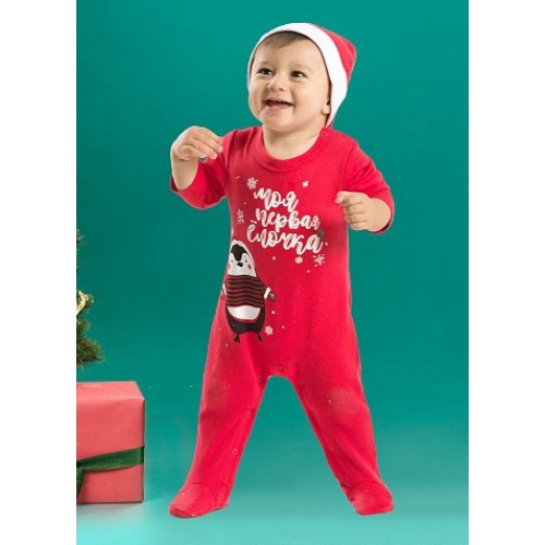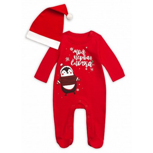 Комплект для мальчиков: комбинезон и шапочка-колпачок. Нарядный трикотажный комбинезон с праздничным принтом: забавный пингвин и надпись "Моя первая ёлочка!". В комплекте шапочка-колпачок, как у Санты.