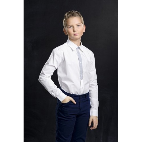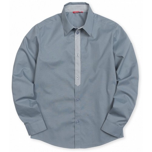 Сорочка прямого силуэта в коммерческих цветах: белом и сером. Планка и внутренняя часть воротника декорирована отделкой из ткани в клетку. Коллекция - школа.