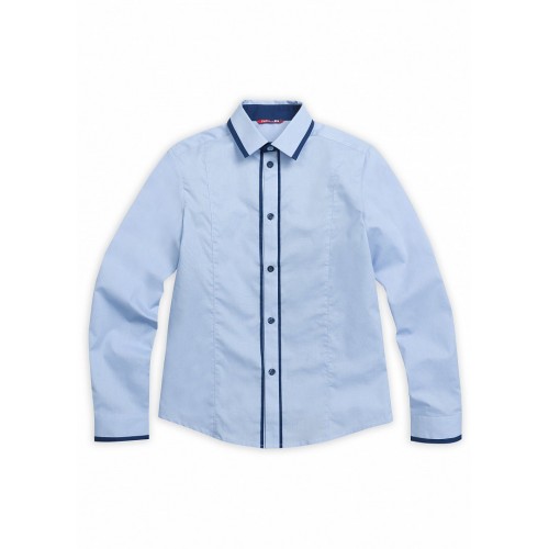 Приталенная сорочка с вертикальными рельефами на переде и спинке. По внешнему краю воротника декоративная окантовка контрастного цвета. Внутренняя манжета контрастного цвета переходит в окантовку нижнего края верхней манжеты. Вдоль планки с обеих сторон проходят узкие контрастные декоративные планочки. Форма воротника Windsor (большое расстояние между углами, можно носить как с галстуком или бабочкой, так и без дополнительных аксессуаров).  Коллекция - школа.