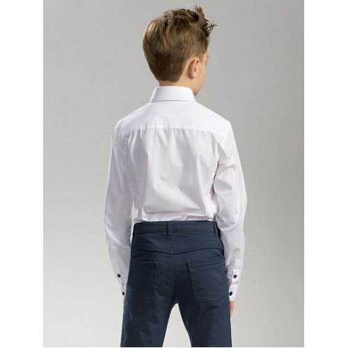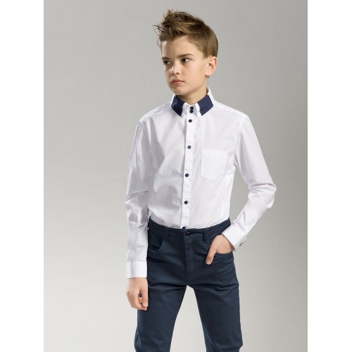 Сорочка для мальчиков. Сорочка малого обьема, полуприлегающего силуэта. Слева нагрудный карман традиционной формы. Двойной воротник с высокой стойкой. создает образ строгого офисного стиля. Верхний воротник с вертикальным членением темно-синего цвета. Концы крепятся к стойке на пуговицу.
