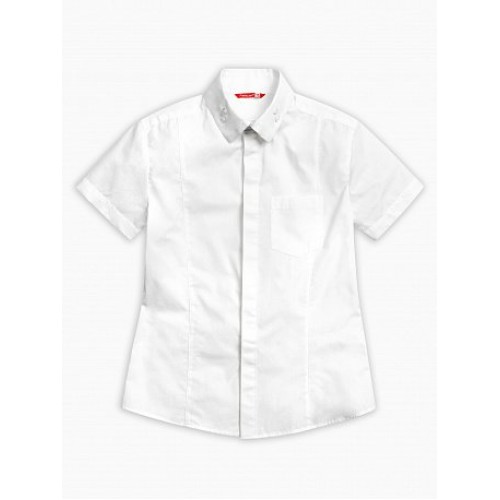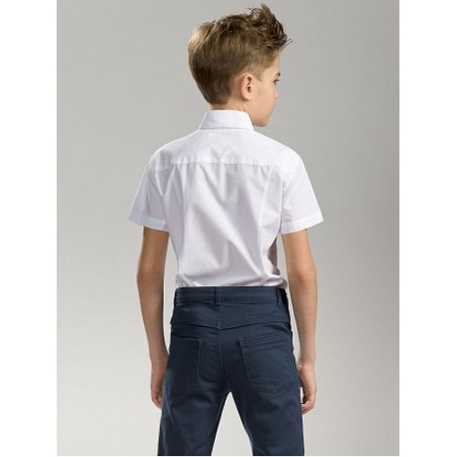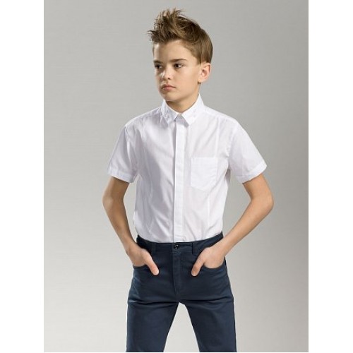 Сорочка с коротким рукавом для мальчиков. Сорочка малого обьема полуприлегающего силуэта. Вертикальные рельефы по переду и спинке. Воротник типа Windsor с декоративными членениями, концы пристегиваются к стойке на нижнюю пуговицу. Верхняя пуговица на воротнике декоративная.