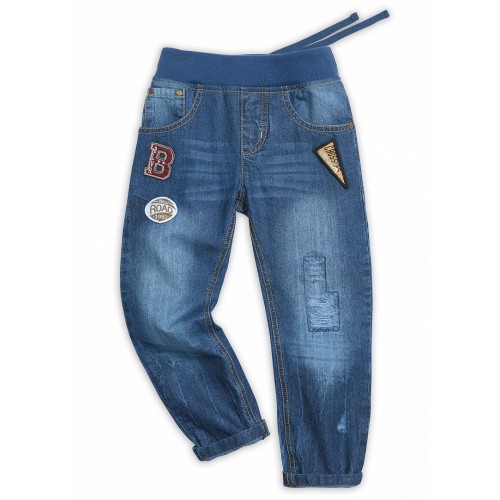Синие джинсы, модные и практичные, на трикотажном поясе из тонкого хлопка. Джинсы с классическими джинсовыми карманами и внутренней регулировкой по линии талии. Основной акцент в декоре – эффекты варки. Декорированы заплатами с потертостями и нашивками.