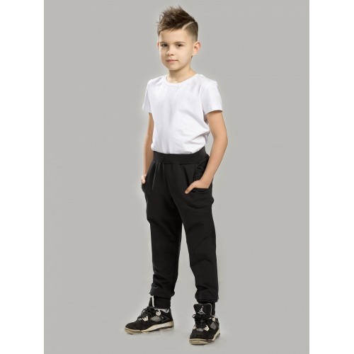Брюки для мальчиков. Трикотажные спортивные брюки с новым силуэтом — удобные, небольшого объема. Низ и пояс обработаны манжетой из риба. В боковых швах наклонные карманы. Для дополнительной регулировки по талии в пояс вставлен эластик и шнурок.