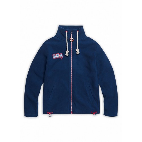 Куртка из флиса на двухцветной тракторной молнии. Пуллер силиконовый в виде спасательного круга. Воротник - высокая стойка, регулируется декоративным шнуром. Боковые карманы. По низу шнурок с стопперами для регулировки объема. Нашивка в стиле истории.