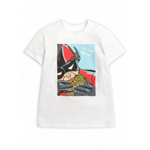 Футболка для мальчиков классического объема. Центральный принт с героем комиксов и лозунгом "Будь клевым, как я".