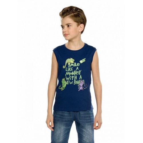 Майка для мальчиков. Классическая майка прямого силуэта не стесняющего движений ребенка. Перевод центрального принта "Улыбайся, как обезьянка с новым бананом".