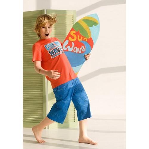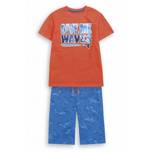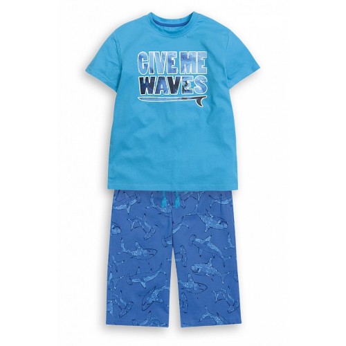Летний комплект футболка и шорты. Модный и стильный. Футболка с ярким принтом акулы, а так же фигурки рыбы расположены по всем шортам. Горловина обработана обтачным швом из рибаны. Низ изделия декорирован строчкой 3-needle. Отличительной особенностью бриджей в этой коллекции является имитация гульфика и прямолинейная форма входа в карман, декор - контрастные закрепки на гульфике и карманах.