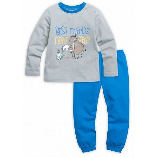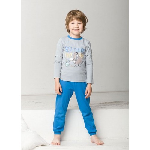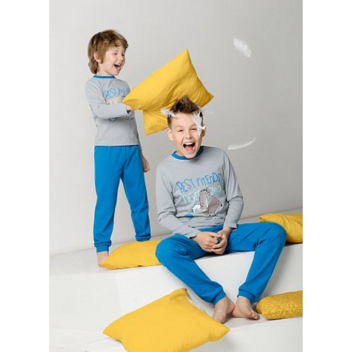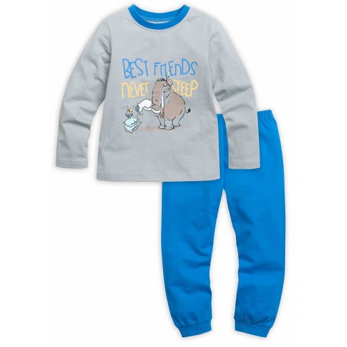 Пижама для мальчиков: джемпер и брюки. На джемпере контрастная отделка горловины, яркий центральный принт: мамонт-симпатяга и арктическая птичка и текстовая надпись (перевод: Лучшие друзья - некогда спать!) . Однотонные брюки, манжеты по низу брючин.