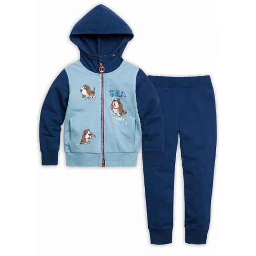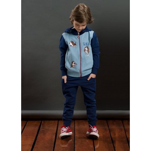 Комплект для мальчиков: джемпер и брюки. Куртка из футера на двухцветной молнии; пуллер силиконовый в виде спасательного круга; капюшон декорирован шнуром; боковые карманы; низ брюк на манжете; боковые карманы.