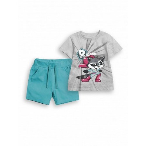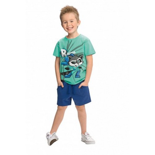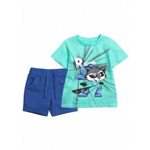 Комплект для детского сада. Футболка с принтом енотом-супергероем и шорты с боковыми карманами, чтобы сложить нужное и важное.