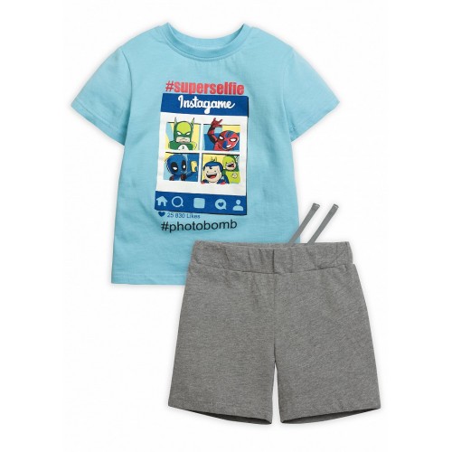 Комплект для мальчиков: футболка и шорты. Футболка классического объема. Центральный принт имитация страницы соц.сетей. Меланжевые шорты. Резинка по поясу, внутренняя регулировка объёма шнурком.
