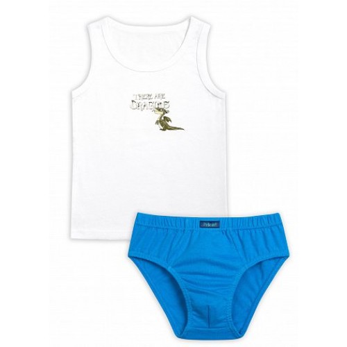 Комплект для мальчиков: майка и плавки. Классическая белая майка с центральным принтом мультяшный дракон. Однотонные плавки.