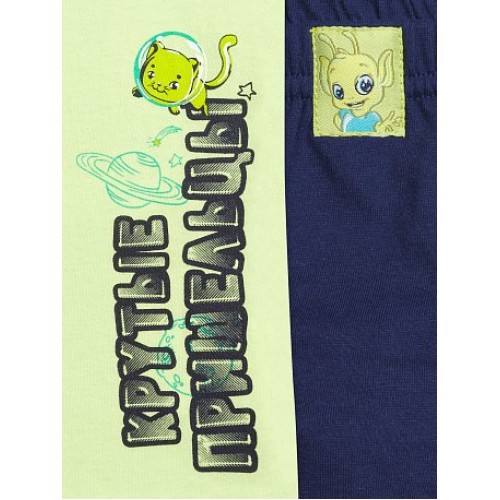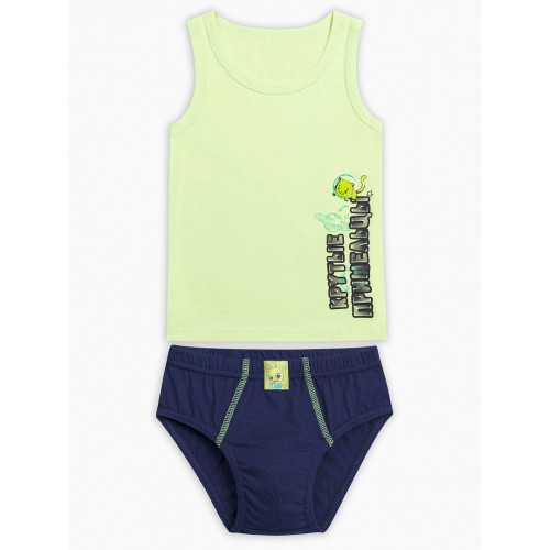 Комплект для мальчиков: майка и трусы. Классическая майка на широких лямках, выполненная в яблочном цвете, сбоку на передней части изделия принт- пришелец и надпись "Крутые пришельцы". Трусы-слипы синего цвета, контрастные декоративные строчки на передней части изделия и нашивка с изображением пришельца.