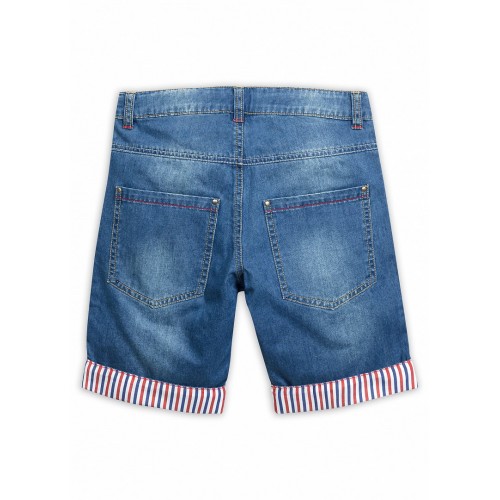 Шорты из тонкой джинсы с отворотами по низу из ткани в полоску. Декоративные контрастные отстрочки. Потайная регуляция по талии, предусмотрены шлевки. Пуговицы в стиле истории.