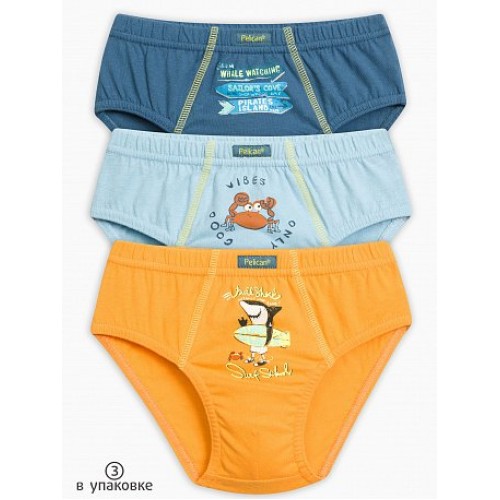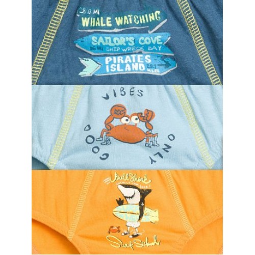 Трусы-слипы для мальчиков. Набор из 3-х трусов. Цвета: джинс, голубой, оранжевый. Центральный принт в морской тематике, декоративные строчки на передней части изделия.