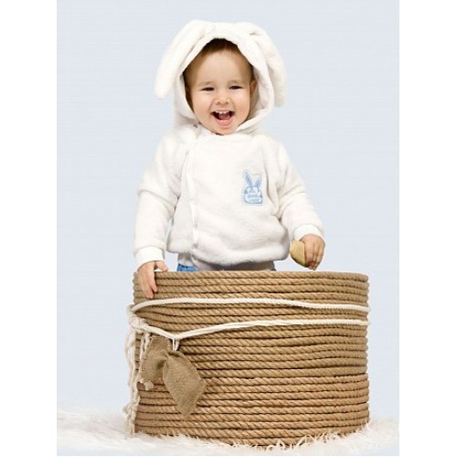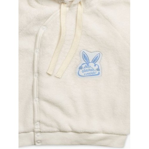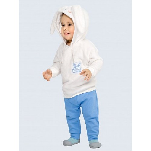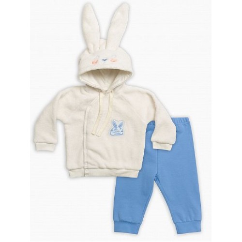 Комплект для мальчиков: курточка и брючки. Курточка из велсофта, на рукавах и по низу - манжеты из рибаны. Одношовный капюшон с мордочкой зайчика и рельефом, в который вставлены заячьи ушки. Регулировка объёма капюшона в виде шнурка. На передней части изделия нашивка: имитация зайчика, держащего облако, и надпись "Люби, обнимай и тискай!". Застёжка на кнопки на передней части изделия. Водорастворимая плёнка с изнаночной стороны нашивка. Брючки из терри, умеренного объёма, по низу - манжеты из основной ткани.