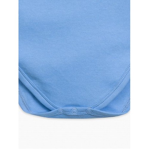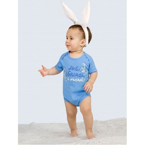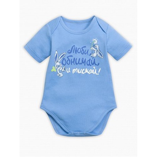 Полукомбинезон для мальчиков. Выполнен в голубом цвете, застёжка на кнопки в нижней части изделия. На передней части изделия центральный принт: невероятно милые зайчики, отрисованные в графике всеми любимых мультфильмов, и надпись "Люби, обнимай и тискай!".