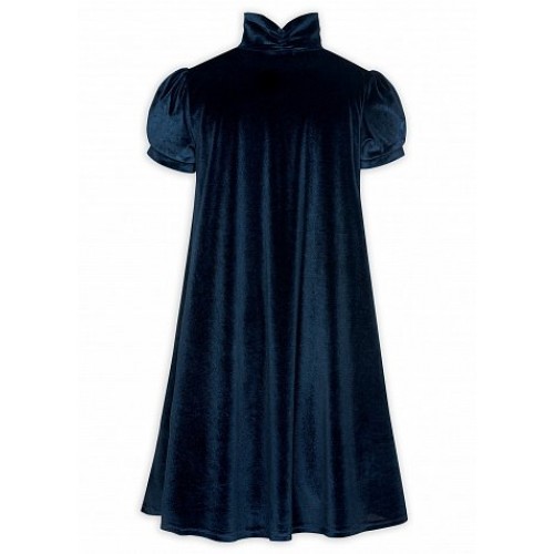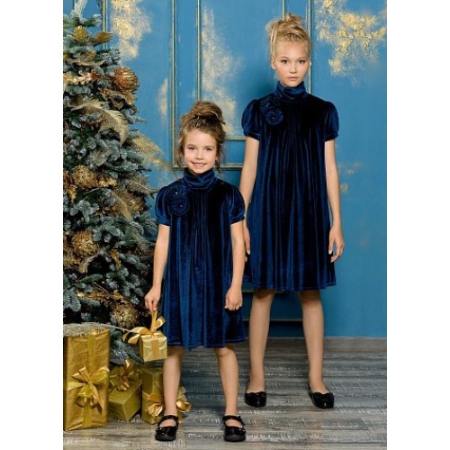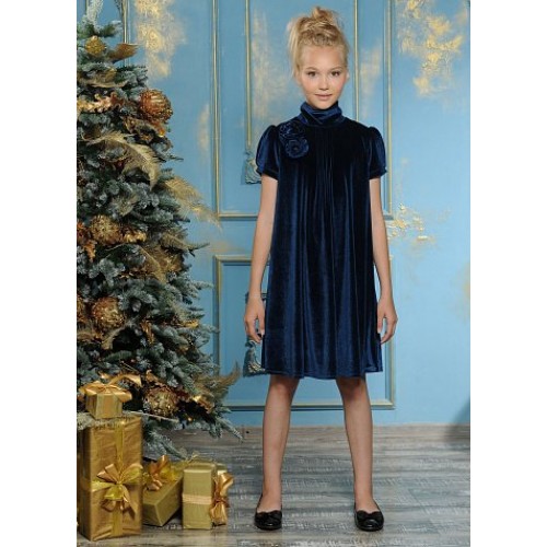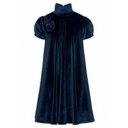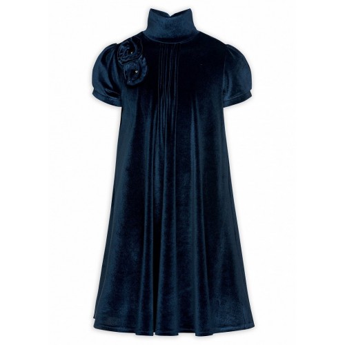 Платье для девочек. Струящийся эластичный бархат, силуэт трапеция; подклад из хлопка; воротник-стойка с драпировкой сзади; застроченные складки по центру переда; рукав-фонарик на манжете со встречной складкой; декоративный цветок по линии плеча.
