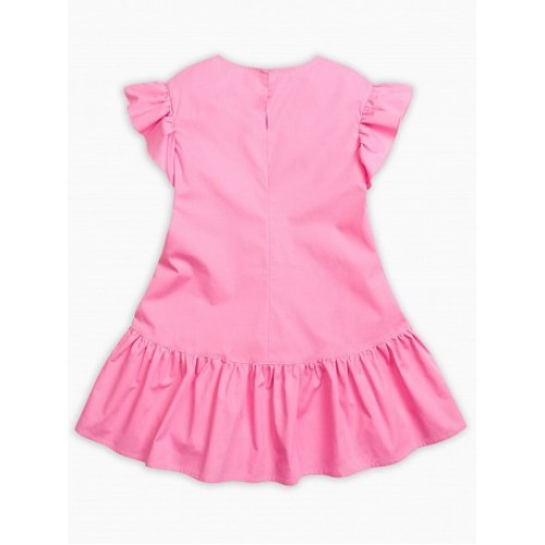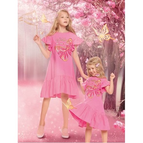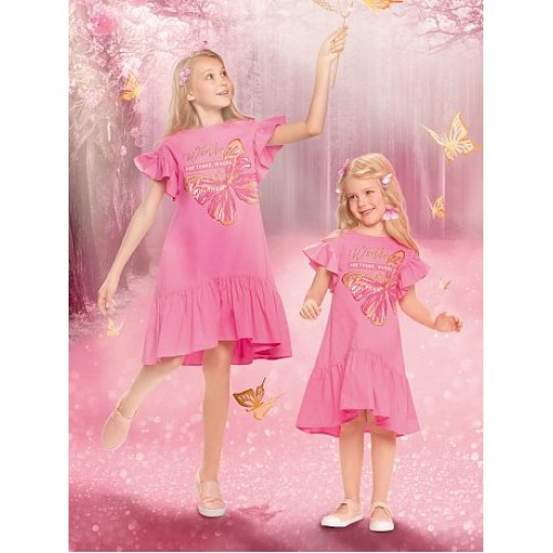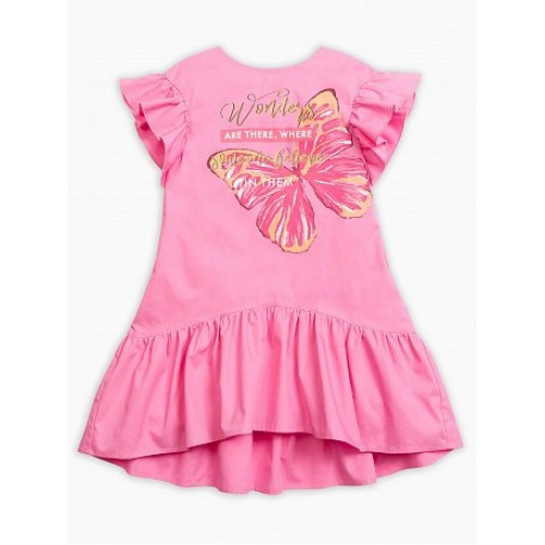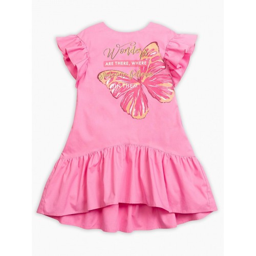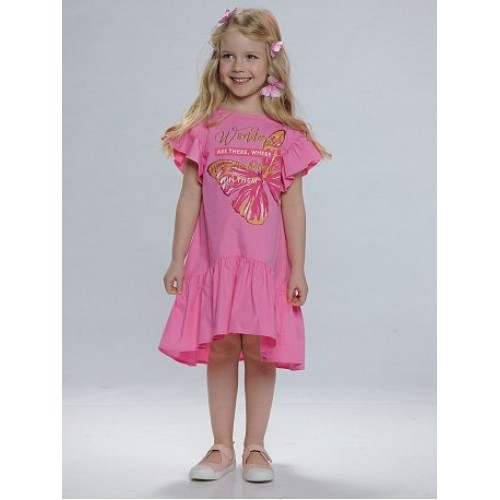Платье для девочек. Новинка! Платье более свободного силуэта, расклешенное к низу; спущенная линия плеча и фигурная линия низа; пройма и низ платья декорированы воланами; перевод принта "Чудеса там, где в них верят".