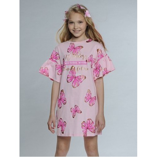 Платье для девочек. Платье свободного силуэта; цельнокроенный спущенный рукав с притачной рюшей; горловина из рибаны.
