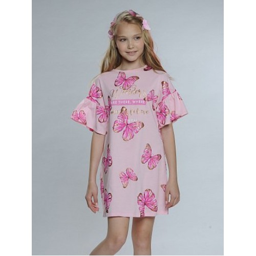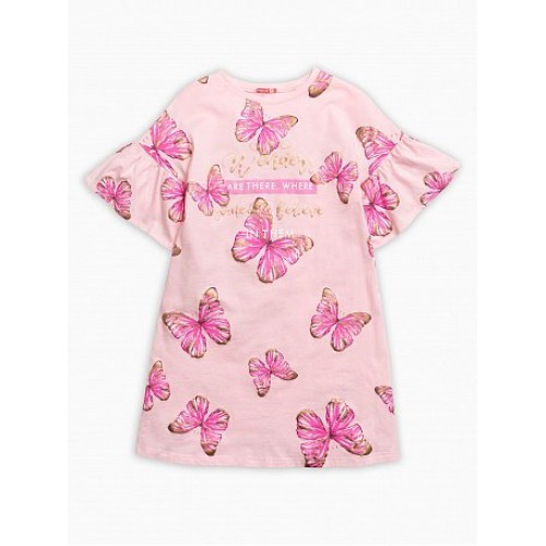 Платье для девочек. Платье свободного силуэта; цельнокроенный спущенный рукав с притачной рюшей; горловина из рибаны.