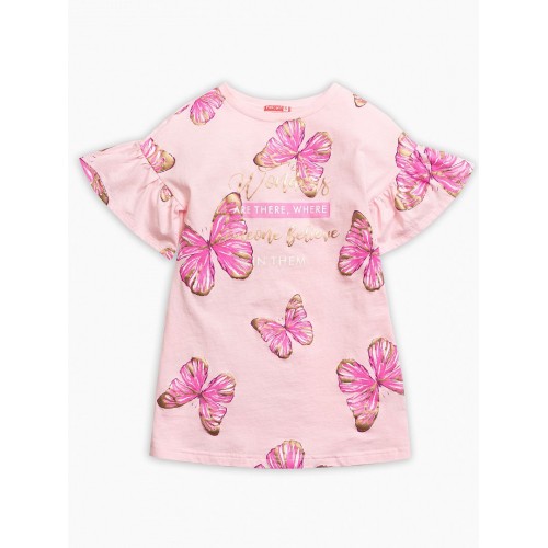 Платье для девочек. Платье свободного силуэта; цельнокроенный спущенный рукав с притачной рюшей; горловина из рибаны.