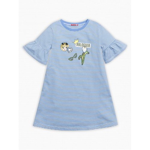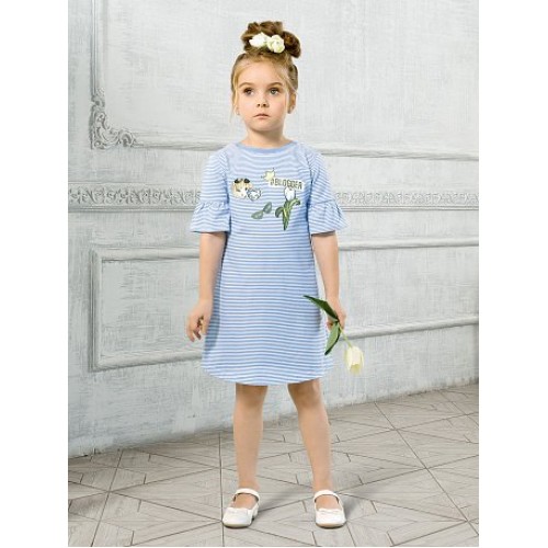 Платье для девочек. Новый трикотаж, тканая полоска, мягкий и пластичный. Силуэт трапеция, рукав втачной с воланом по низу. Стойкий мягкий soft-принт- имитация нашивки.