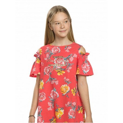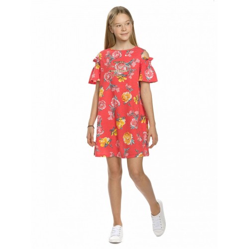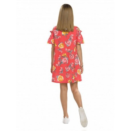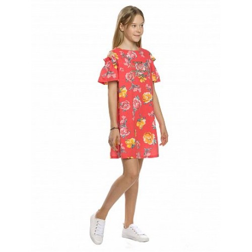 Платье для девочек. НОВИНКА! Более расширенный силуэт трапеция. Открытые плечи, новая форма объёмных рукавов-воланов, собранных на несколько рядов шпульной резины. Центральный принт с золотом.