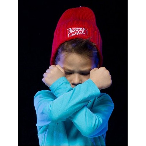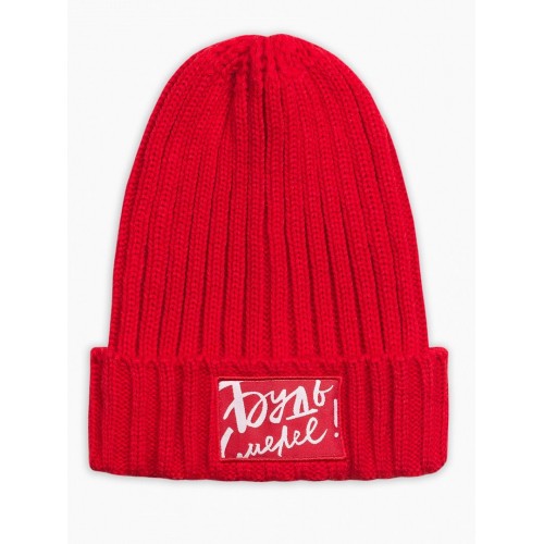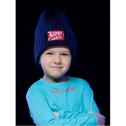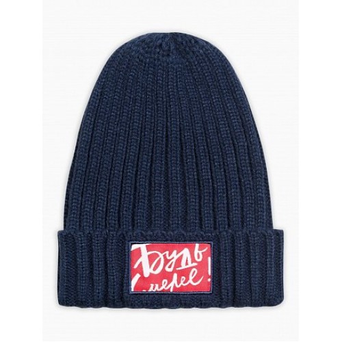 Шапка для мальчиков. Вязаная шапка с отворотом, слегка вытянута вверх, нашивка