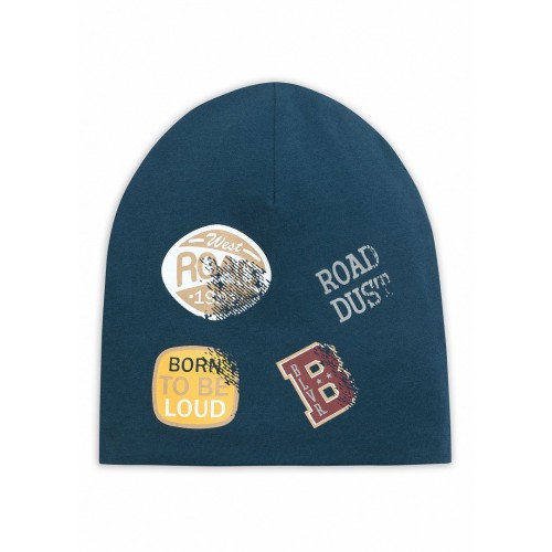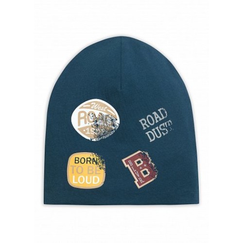Шапка сшита из трикотажного полотна. Двухслойная. Принт имитирует нашивки.