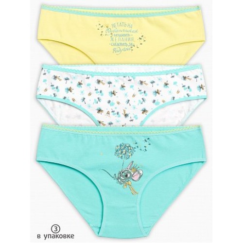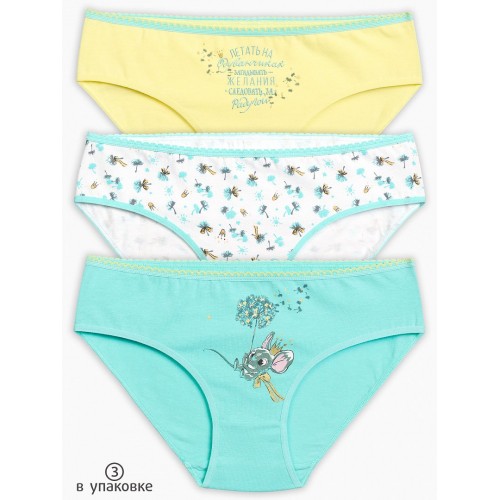 Трусики-слипы для девочек. Комплект из 3-х трусиков. Цвета: ментол, жёлтый, белый. Тематика принта: забавные сказочные мышата, зонтики одуванчиков и маленькие золотистые короны. По талии - резинка с фестонным краем.