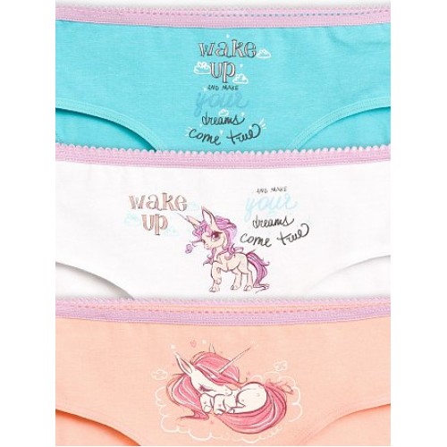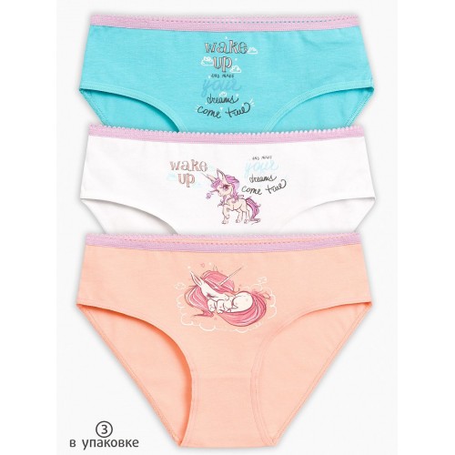 Трусики-слипы для девочек. Комплект из 3-х трусиков. Цвета: персиковый, бирюза, белый. Принт: волшебные пони. По талии - контрастный эластик.